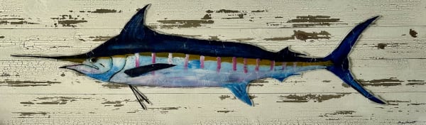 Introducing "Marvin," the Marlin brought to life in limited edition hand-painted artwork by Marji Knecht. These whimsical pieces feature vibrant colors and a 3D look, thanks to being covered in clear sea glass and resin. Each artwork is unique, but the design will only be reproduced 25 times before being discontinued, ensuring exclusivity for collectors. Don't miss the chance to own a piece of Marji Knecht's charming and colorful coastal artistry with "Marlin".