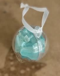 Seaglass Ornament Ball. Each one handmade and one of a kind holiday decoration. Item includes various colors of seaglass and ribbon. Primary colors used: teals and mints. Colors Available: pink, lavendar, white, powder blue, cobalt blue, and red.