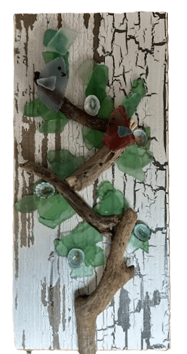 Shabby Plank Seaglass Love Bird Tree. A beautifully shaped seaglass tree with two love birds nestled on the branches. Made with seaglass and driftwood. These oriental inspired seaglass trees are original designs that become a highlight of your decor.