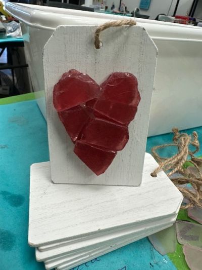 This seaglass heart on a white wooden gift tag makes for a perfect, thoughtful gift, embodying the serene beauty of the ocean and the rustic charm of handcrafted art. Whether used as a decoration or a keepsake, it is sure to bring joy and a touch of coastal magic to any setting.