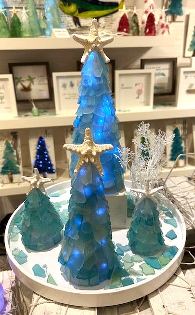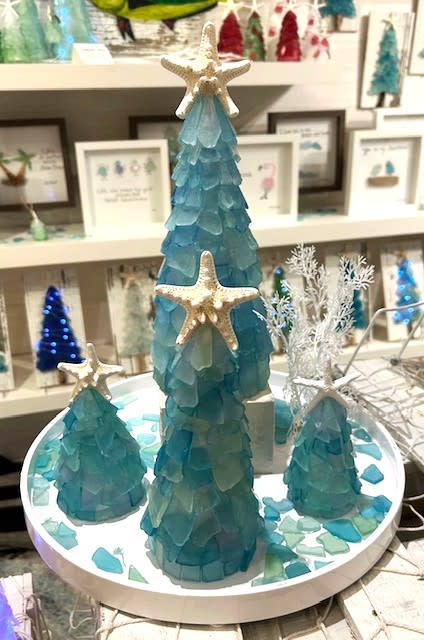 Celebrate the season with a harmonious quartet of seaglass Christmas trees, thoughtfully arranged in a dimensional box set that captures coastal holiday magic in varying sizes and glows.