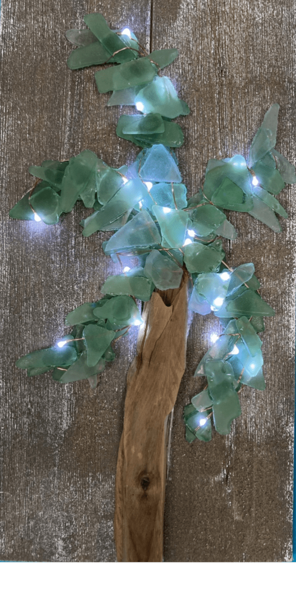 A Seaglass Palm Tree lit with Fairy lights makes for a coastal Christmas tree or a a year round coastal accent.