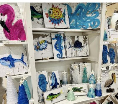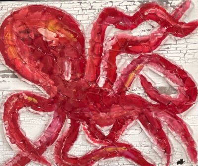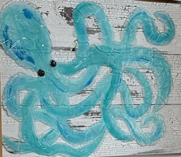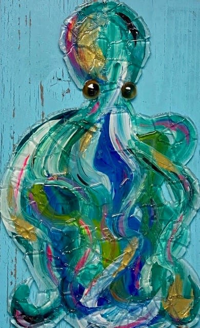 Hand Painted Octopus on a weathered plank board that is covered with clear Seaglass and then resined to create a unique 3D visual art. No two pieces exactly the same, color scheme will vary and all pieces signed by artist.