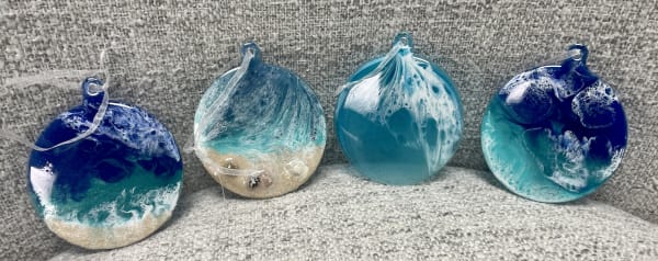 Ornaments made with beautiful ocean colors to offer a seascape touch to your Christmas tree. They come in a variety of beautiful ocean color combinations. No two ornaments the same.